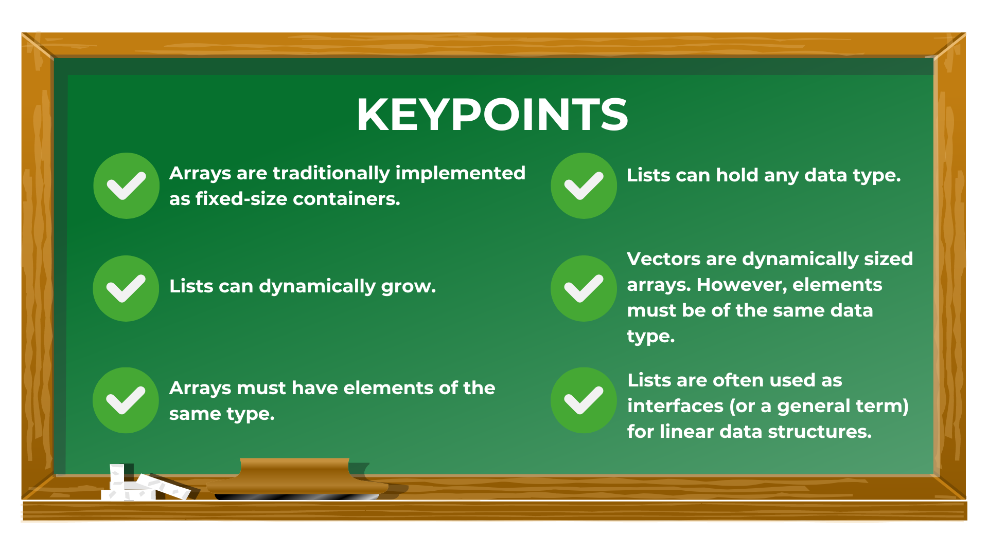 Moreover, in most programming languages, arrays are fixed-size. If you look at that Java array for example, there are no methods to adding elements to such an array. This contrasts to Python where arrays can be as big as possible. There are ways to make array sizes dynamic (like in Python), as to which, vectors exist. In C++, you have the std::vector and in Java, the ArrayList<T> and the Vector<T> exist.