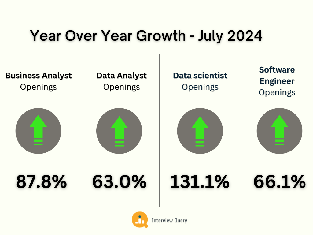 When comparing July 2024 to July 2023, the number of open positions in data science soared year over year. Openings for data scientists grew 130% year over year.