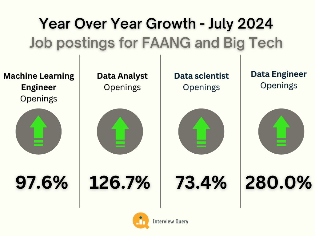 The number of job openings for FAANG and Big Tech companies skyrocketed year over year. Data engineer openings, in particular, rose 280% year over year as companies invested in data infrastructure in the context of the rise of AI.
