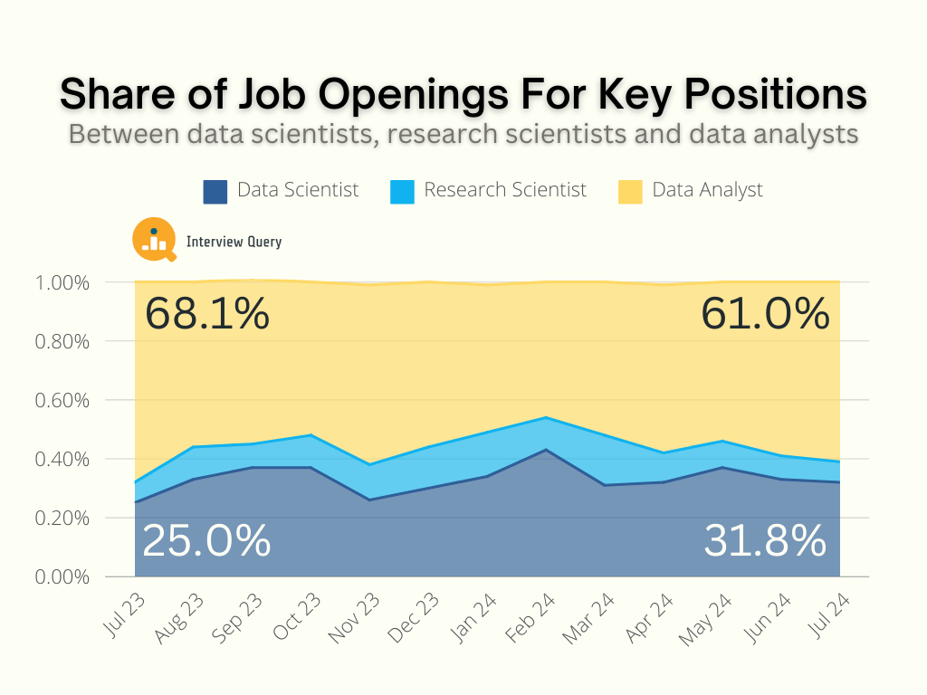 In 2024, the proportion of job openings for data scientists has remained steady in relation to openings for data analysts.