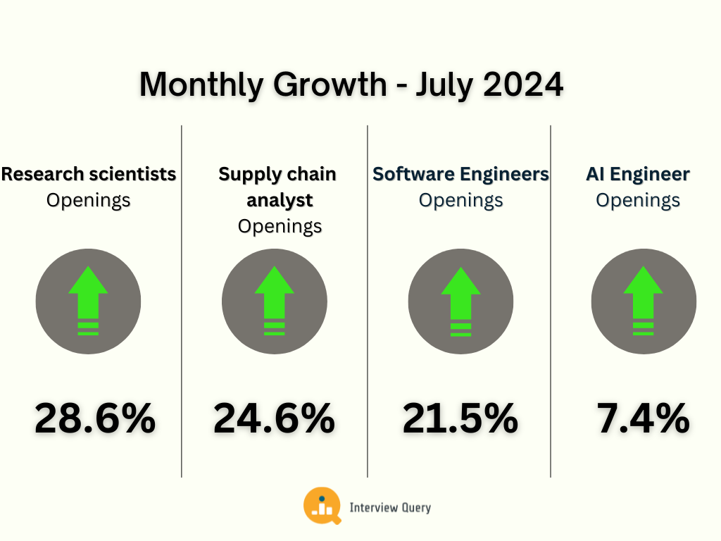 AI advancements are creating new opportunities in data science. Job openings in research science grew 29% month over month, while AI engineering openings grew 7% month over month.
