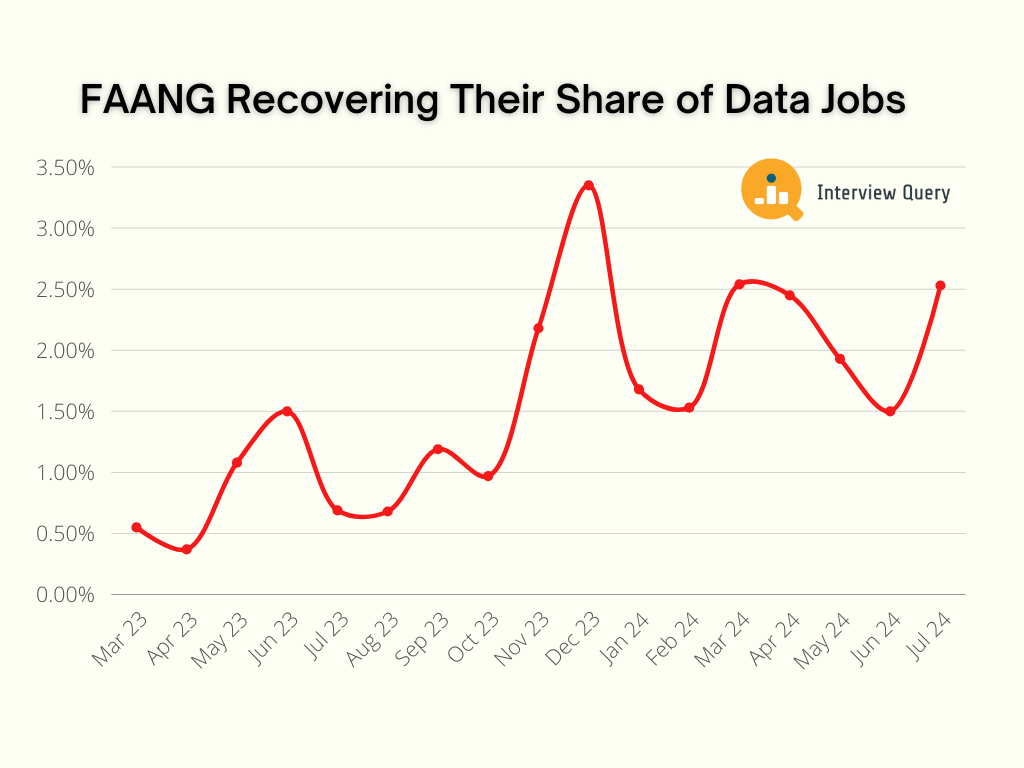 During the first half of 2024, FAANG and Big Tech companies have regained their positions as key employers in the data science ecosystem.