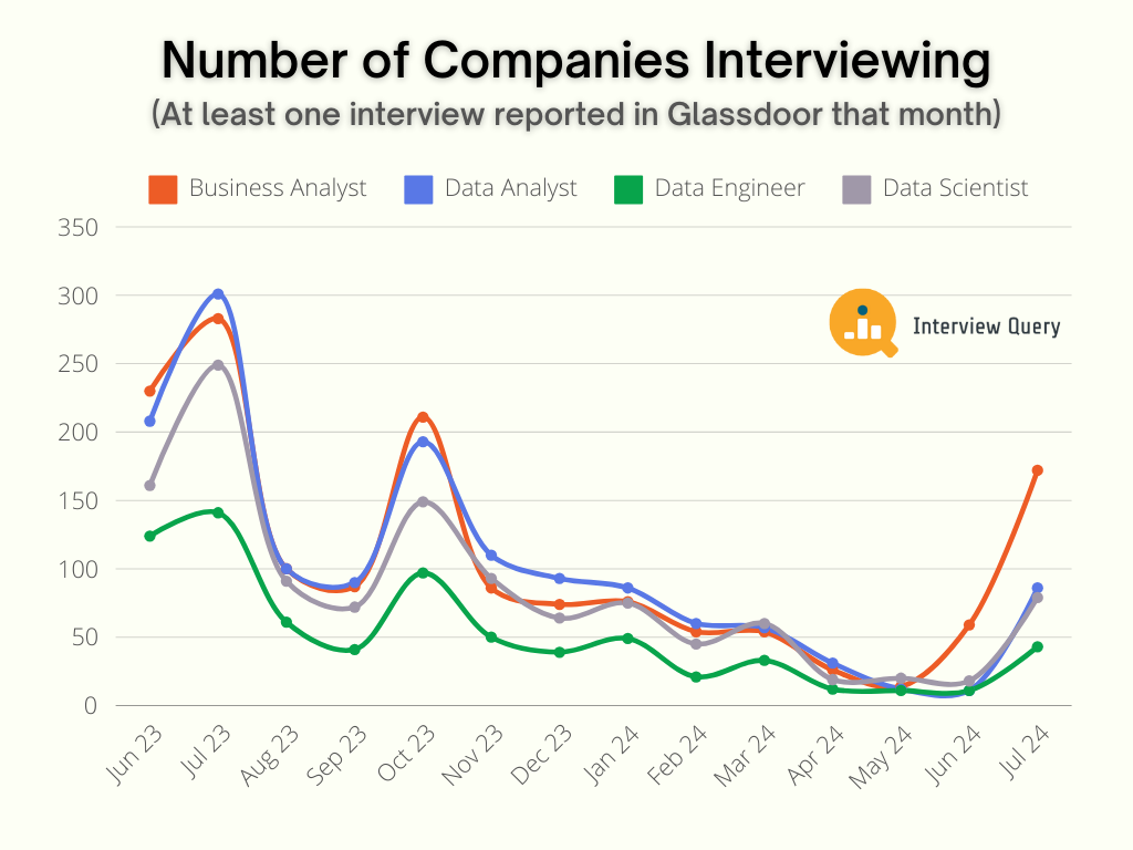 We checked the number of companies actively hiring each month by identifying companies with at least one interview reported on Glassdoor for a data-related position.