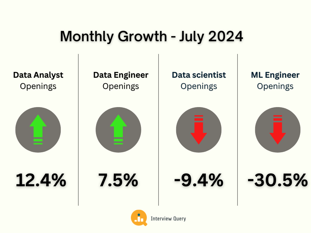 Job openings rose 12.4% for data analysts and 7.5% for data engineers month over month. Openings in data science dropped 9.4% in the same time period.