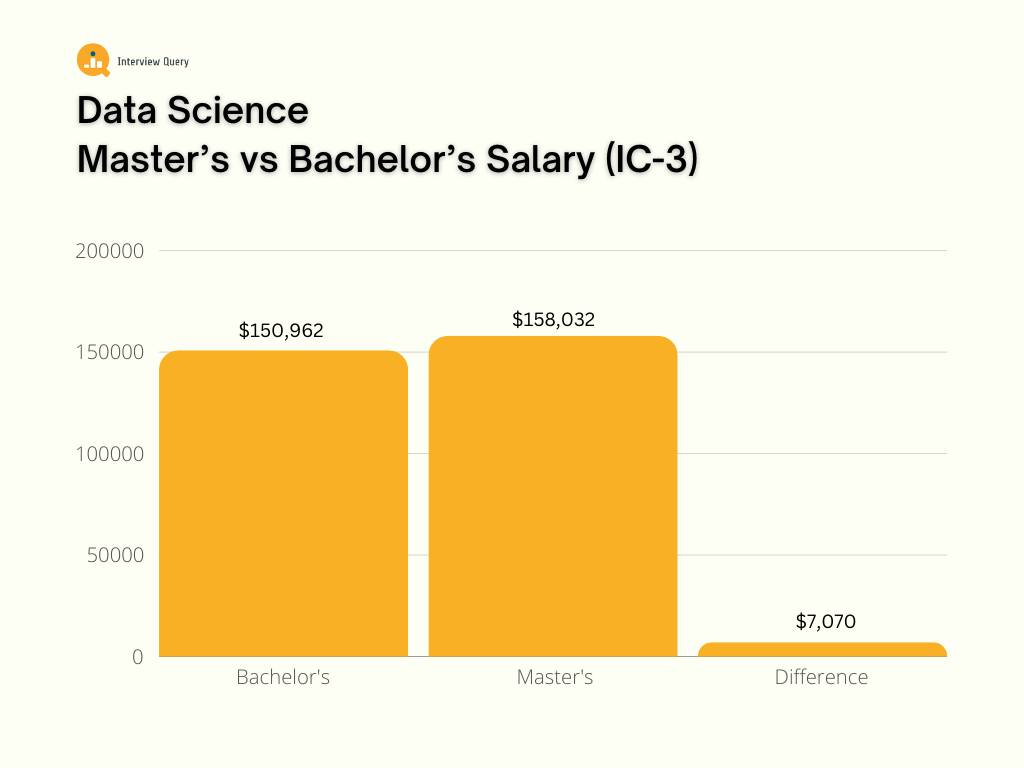 At all career levels, a master’s degree results in a salary increase, including the master’s in data science salary, of course. Yet, the wage gap increases significantly among entry-level to mid-career data scientists. Here’s a comparison of bachelor’s and master’s degrees in data science salaries depending on the career level: