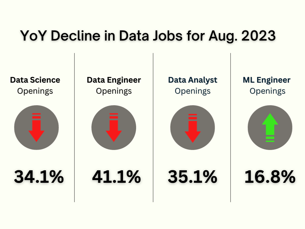 Anecdotally, we’ve spoken with multiple Meta recruiters who’ve confirmed that hiring is back on for data science roles, especially so for AI research. Many recruiters at Big Tech companies are trying to win the race for AI talent, which is why that role is pulling away from the rest of the data science industry.