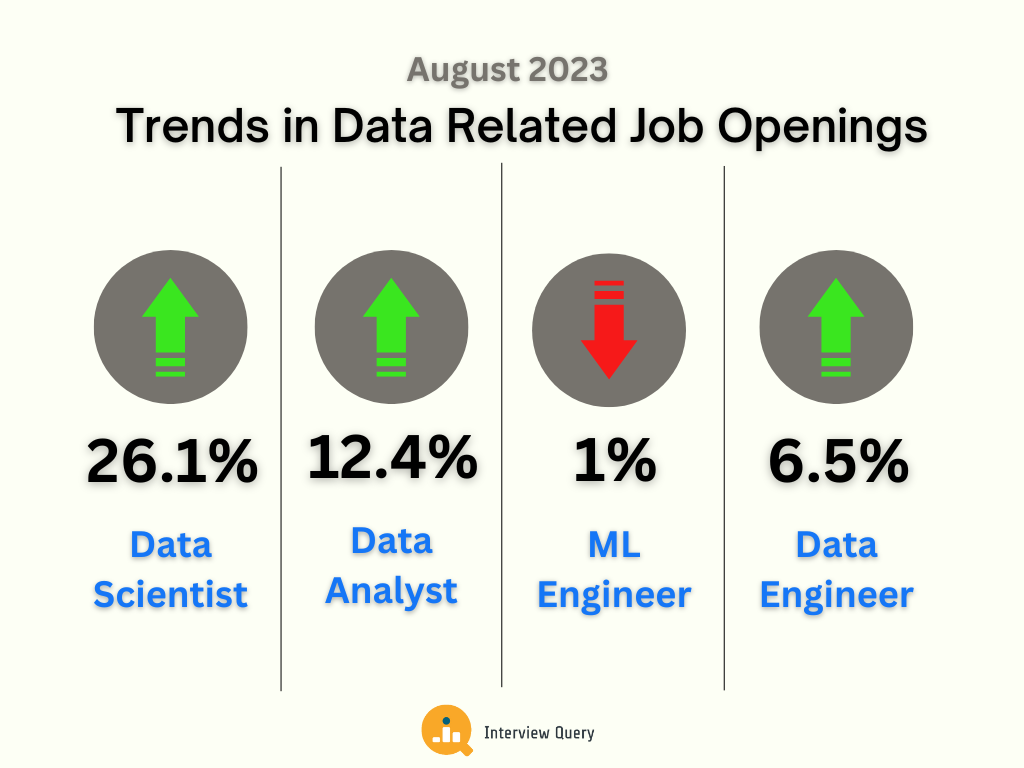 In contrast, the same period from July 2023 to August 2023 saw a positive trend in job openings for most data-related positions, with the exception of machine learning engineering, which experienced only a slight decrease of -1%.