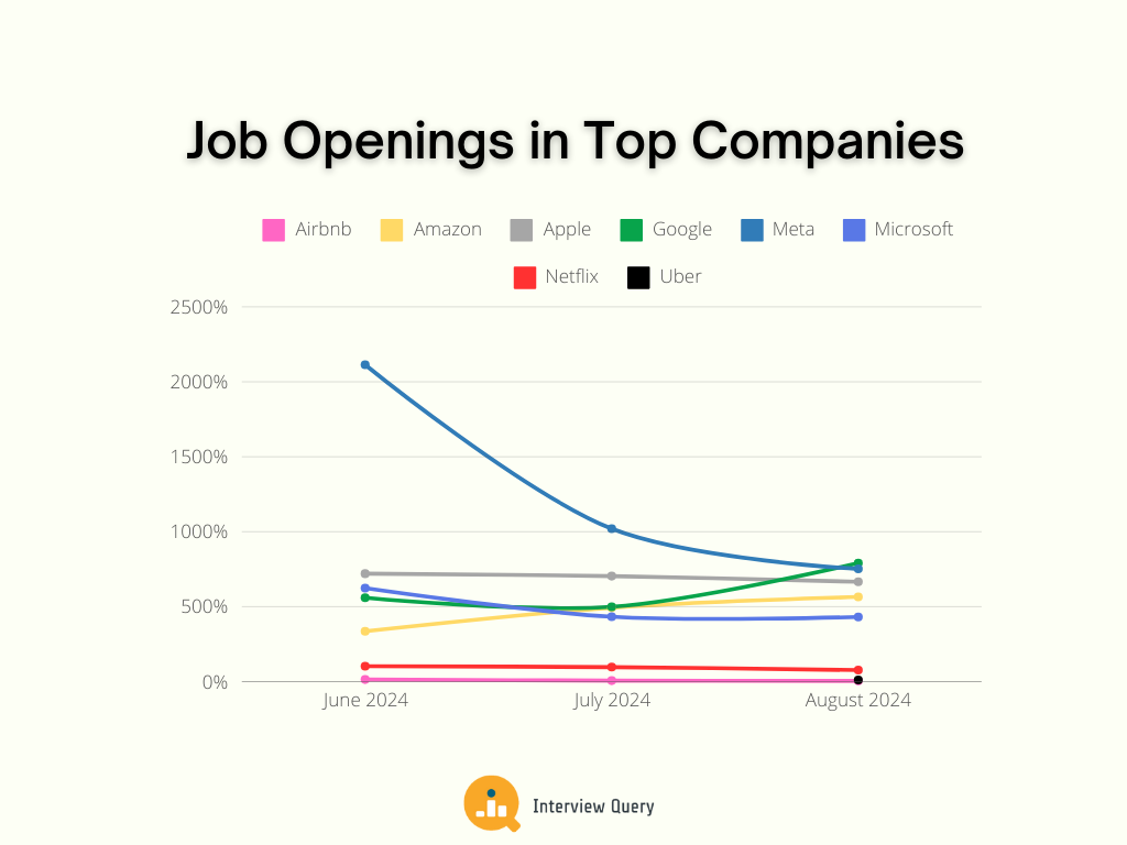 The number of job openings at some top companies, including Netflix, Airbnb, and Apple, remained almost unchanged from June to August. This suggests that job postings from previous months could still be active, particularly for those with lower volumes, such as Netflix and Airbnb.