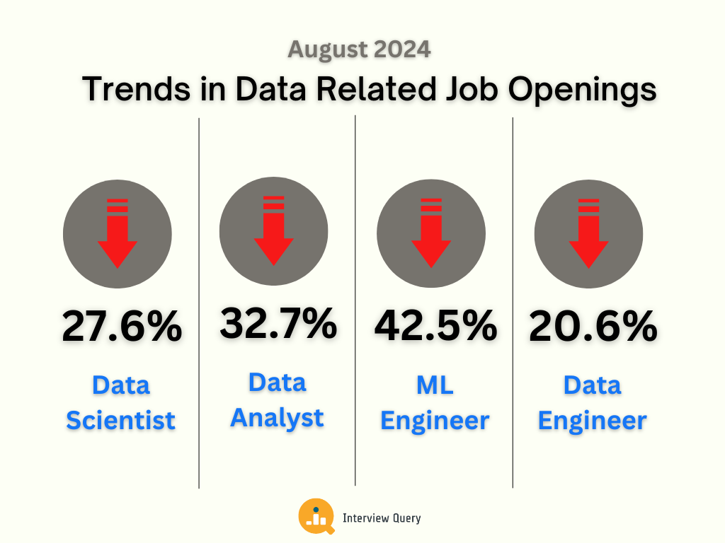 Job openings for data scientists, data analysts, data engineers, and ML engineers declined in August 2024.