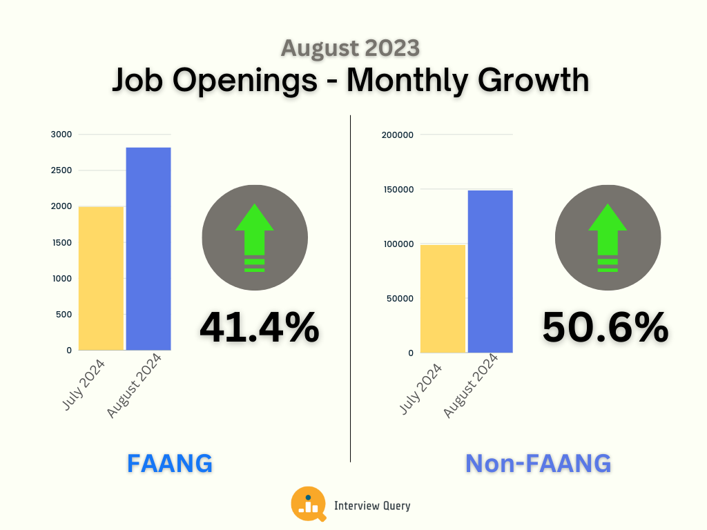 The job market appeared more optimistic in this aspect during the same period last year (July 2023 to August 2023), with FAANG job openings increasing by 41% and total job openings rising by 50%. While both FAANG and total job openings surged last year, the current year shows a slowdown in the broader market, even as FAANG companies continue to increase hiring.