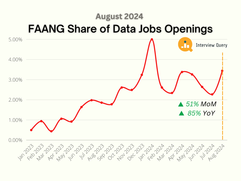 The share of job openings from FAANG companies in August 2024 represents 3.4% of the total job market, a significant increase from 2.2% in July 2024.