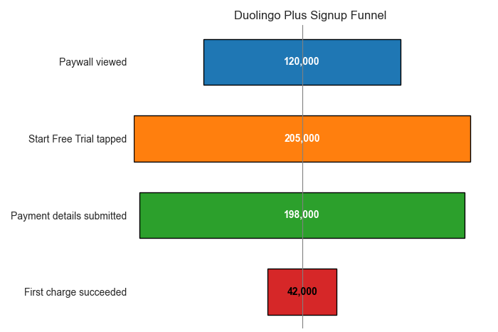 You’ve just launched a 7-day free trial paywall for Duolingo Plus and are monitoring the user journey through the funnel. You pull up a visualization and notice something odd.