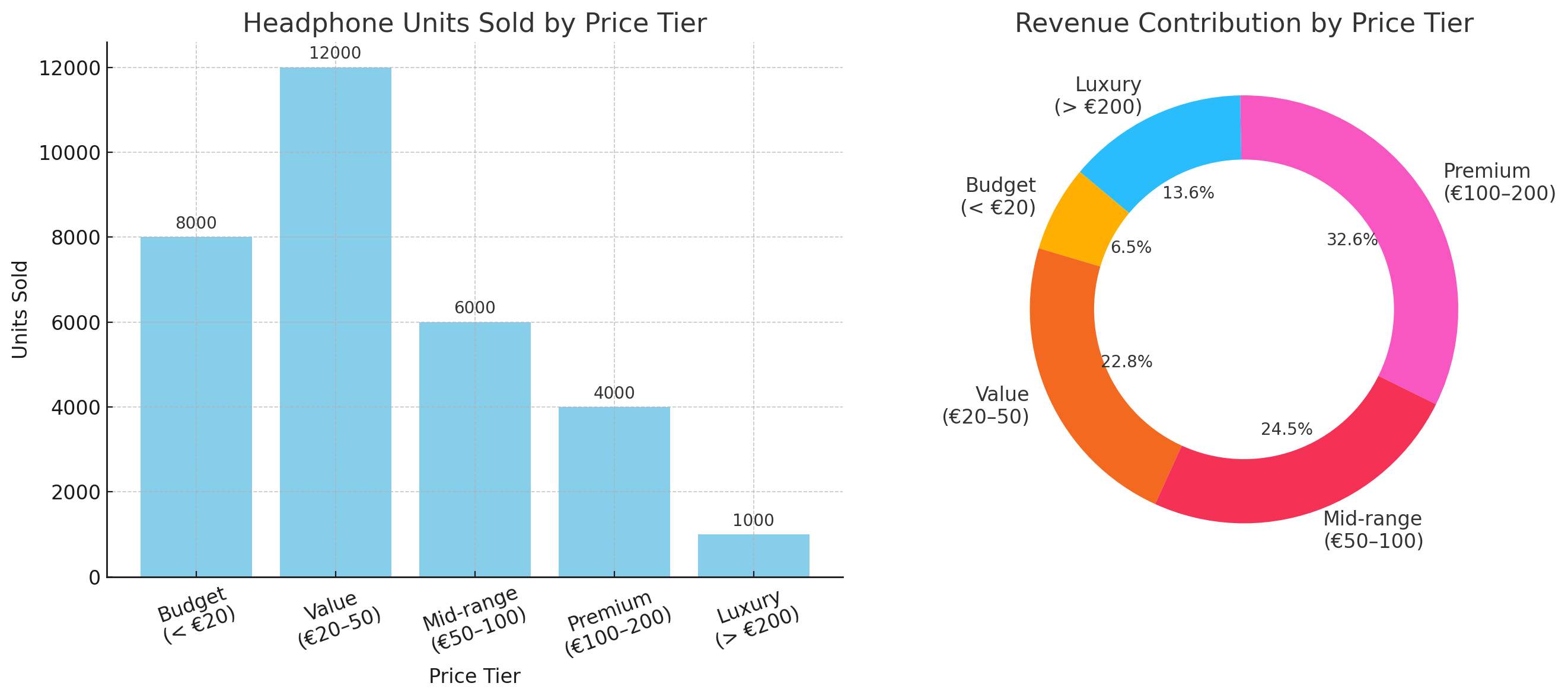 Let’s say you work at a European e-commerce company that sells headphones across five pricing tiers. You’re given two charts: one showing units sold per tier, and another showing the revenue contribution percentage based on estimated average selling prices.